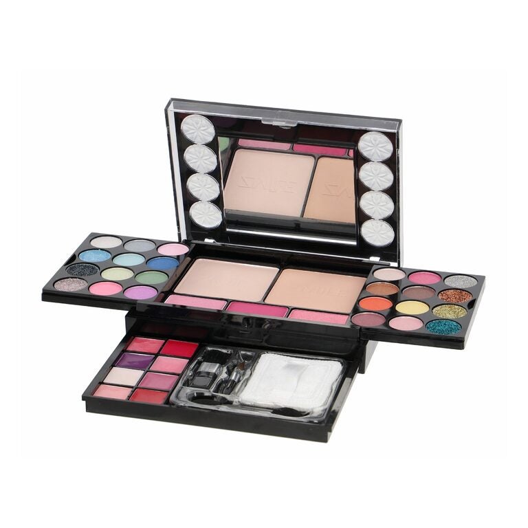 32 x eye shadow 5 x Rouge 3 x Eyebrow powder Eyebrow Wax 4 x Cream Eyeshadow 2 x Eyeshadow Base 8 x Concealer 2 x lip gloss lipstick mini mascara 2 x lip liner Brush 3 x Double Eyeshadow Applicator Integrated Mirror